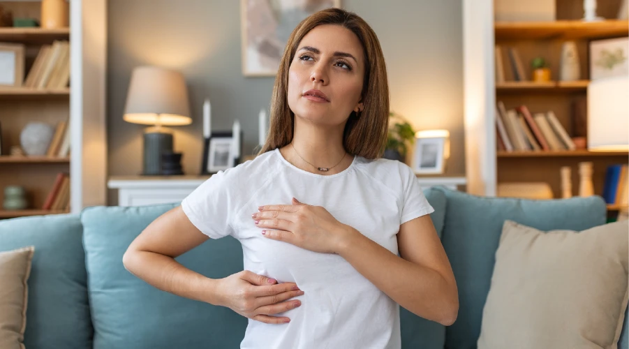 Then repeat the steps while pushing down on your hips to tighten your chest muscles. Finally, examine your breasts while bending at your waist with your hands on your hips. This will allow you to see any dimpling of the skin.